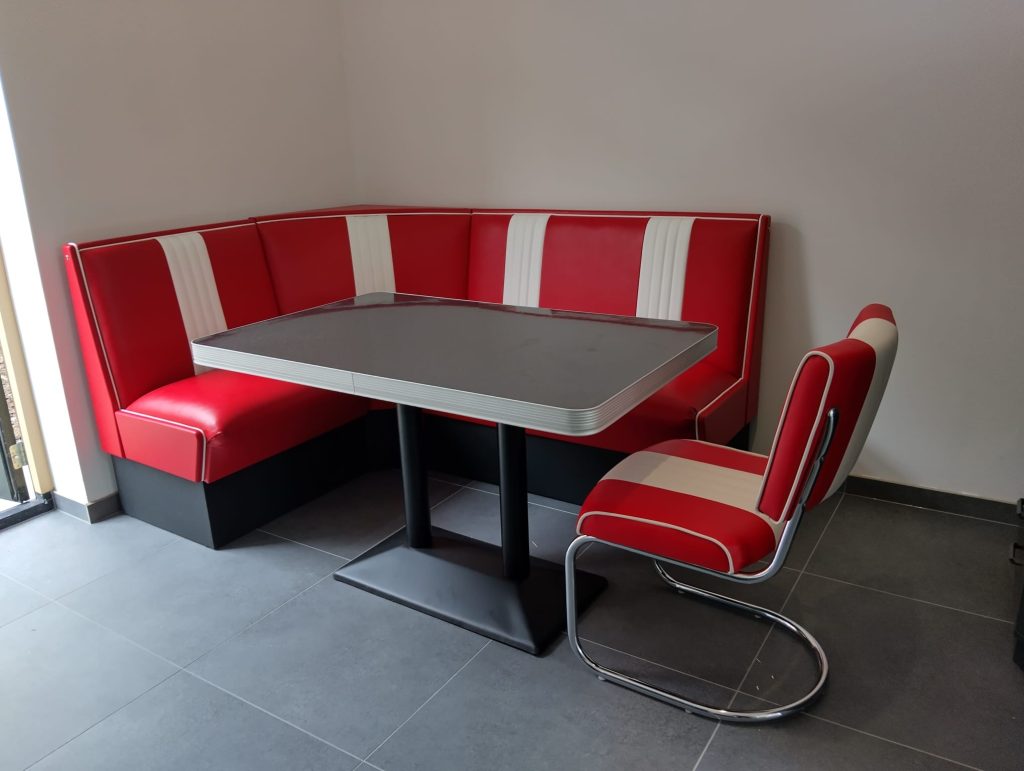 Het geheel is afgewerkt met een bijpassende retro eettafel met profielrand en een losse stoel in dezelfde bekleding. Levering en montage hebben we op locatie verzorgd, klaar voor gebruik!